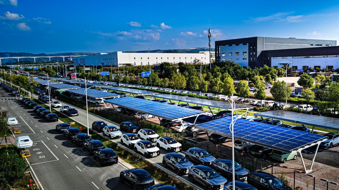 鸟瞰工厂屋顶,密密麻麻的光伏板在阳光下泛着蓝光,工厂创新采用合同能源管理模式,利用26万平方米厂房屋顶及停车场建设36MW光伏电站,年发电量超2500万度,满足工厂19%的用电需求,年降碳约2.3万吨。
