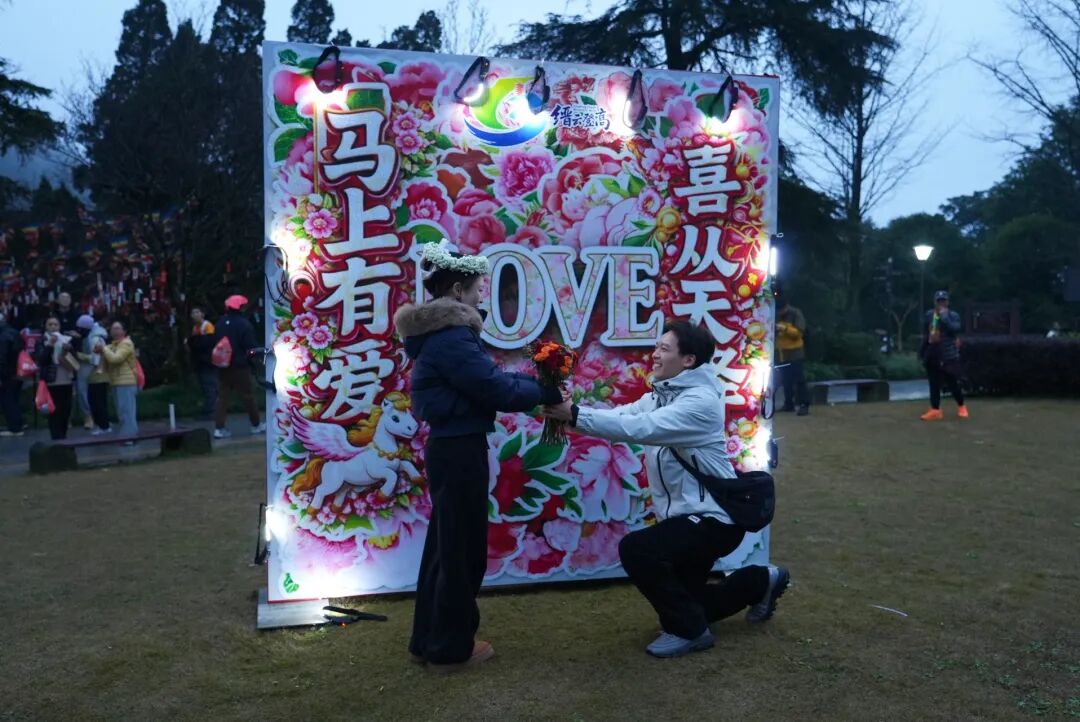 1月1日早上,市民游客们火热开启了“缙云登高·祈福2026·马上好运”登高活动。登高结束后,市民肖摇手捧鲜花,来到女友陈虹西面前单膝跪地,在市民游客的热烈掌声中求婚成功。